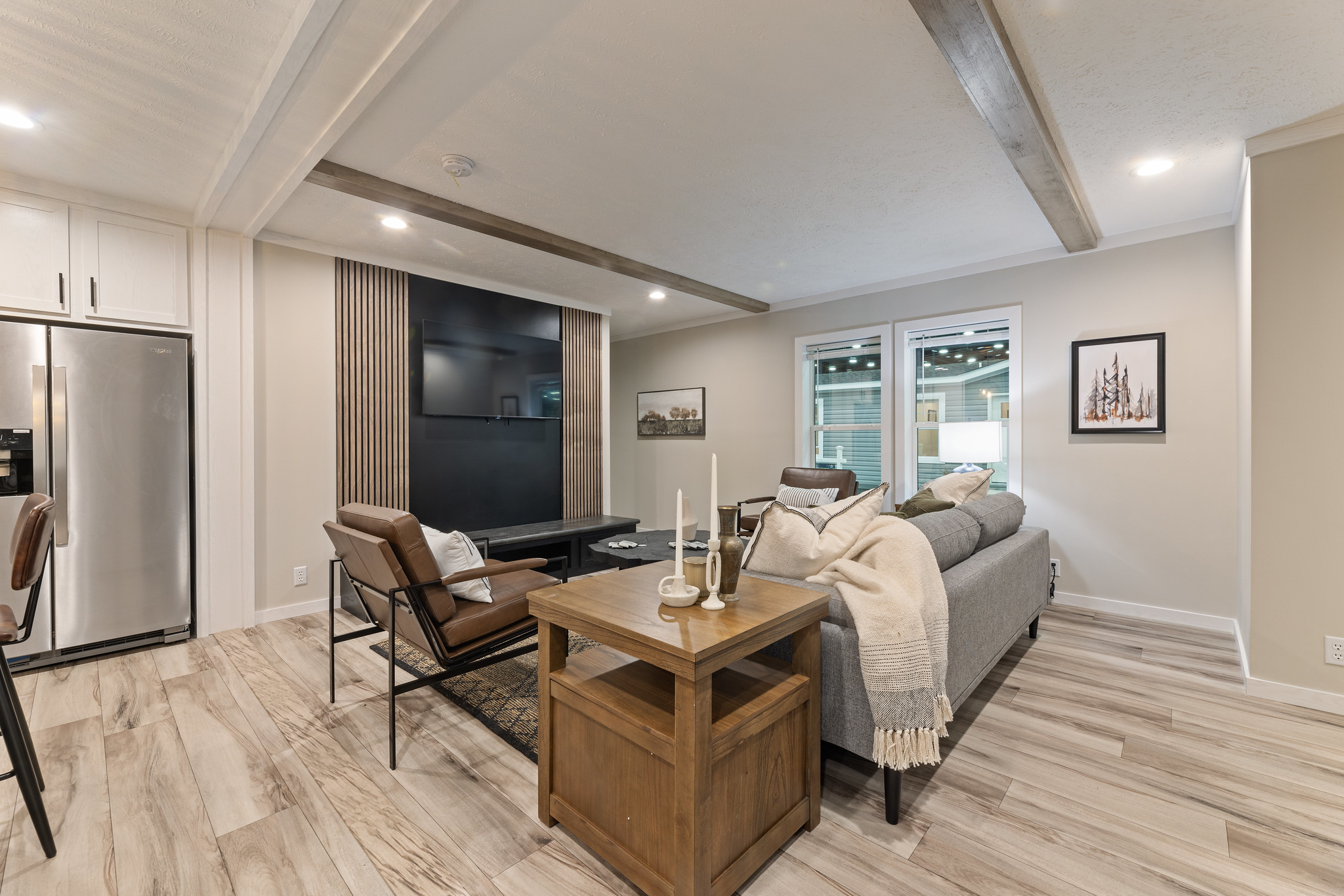 Step inside, and you’ll find a living area that blends elegance with comfort. Beamed ceilings with acoustic slat wood accents create warmth and texture, while the open-concept layout makes the space feel expansive and inviting. Whether you’re entertaining guests or unwinding after a long day, the Atmos provides the perfect setting.